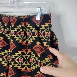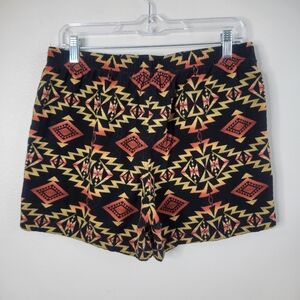 Stylish tribal print shorts featuring black and orange patterns. Perfect for casual wear.