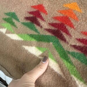Design: Jacquard-woven Southwestern/geo motif with earth-tone tan base and multicolor accents (red, orange, yellow, green, white)