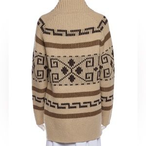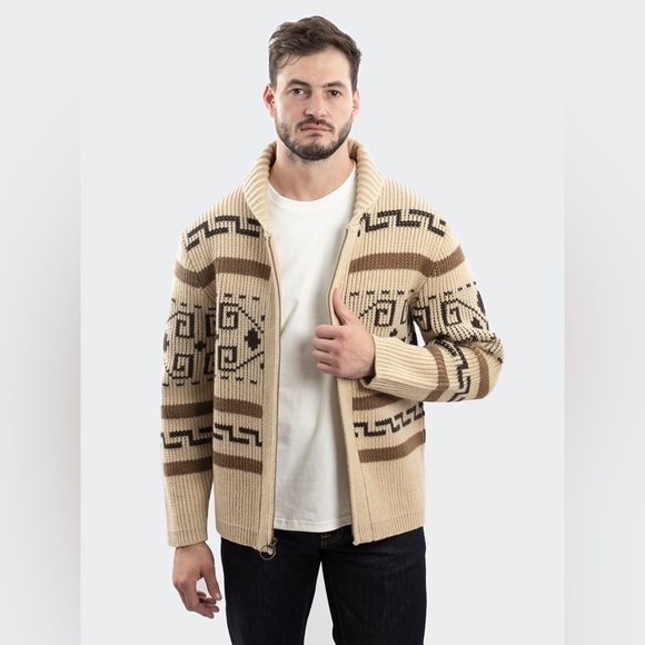 Stylish cardigan with geometric patterns. Features a cozy shawl collar. Perfect for layering.