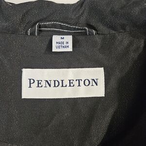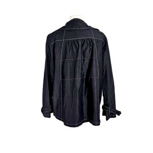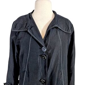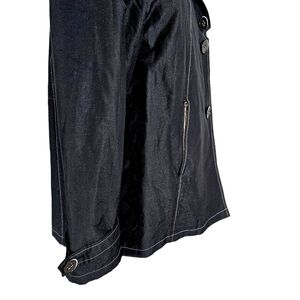 Contemporary Pendleton black sparkly trench coat swing jacket. Large buttons on front, contrasting stitch seams, button belted trim at the sleeves. A classic style with the just the right amount of contemporary finishes. A great season transition jacket, easy to throw on on cooler days to add style. Excellent condition.