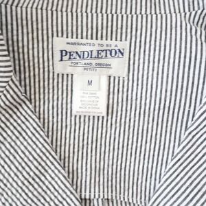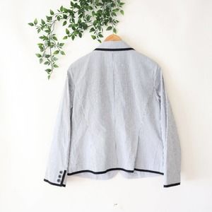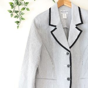 Elegant black and white striped blazer. Features button closure and notched lapel. Perfect for formal occasions.