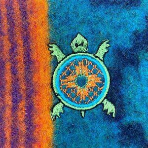 Pendleton wool blanket material with beautiful woven print and an embroidered turtle.