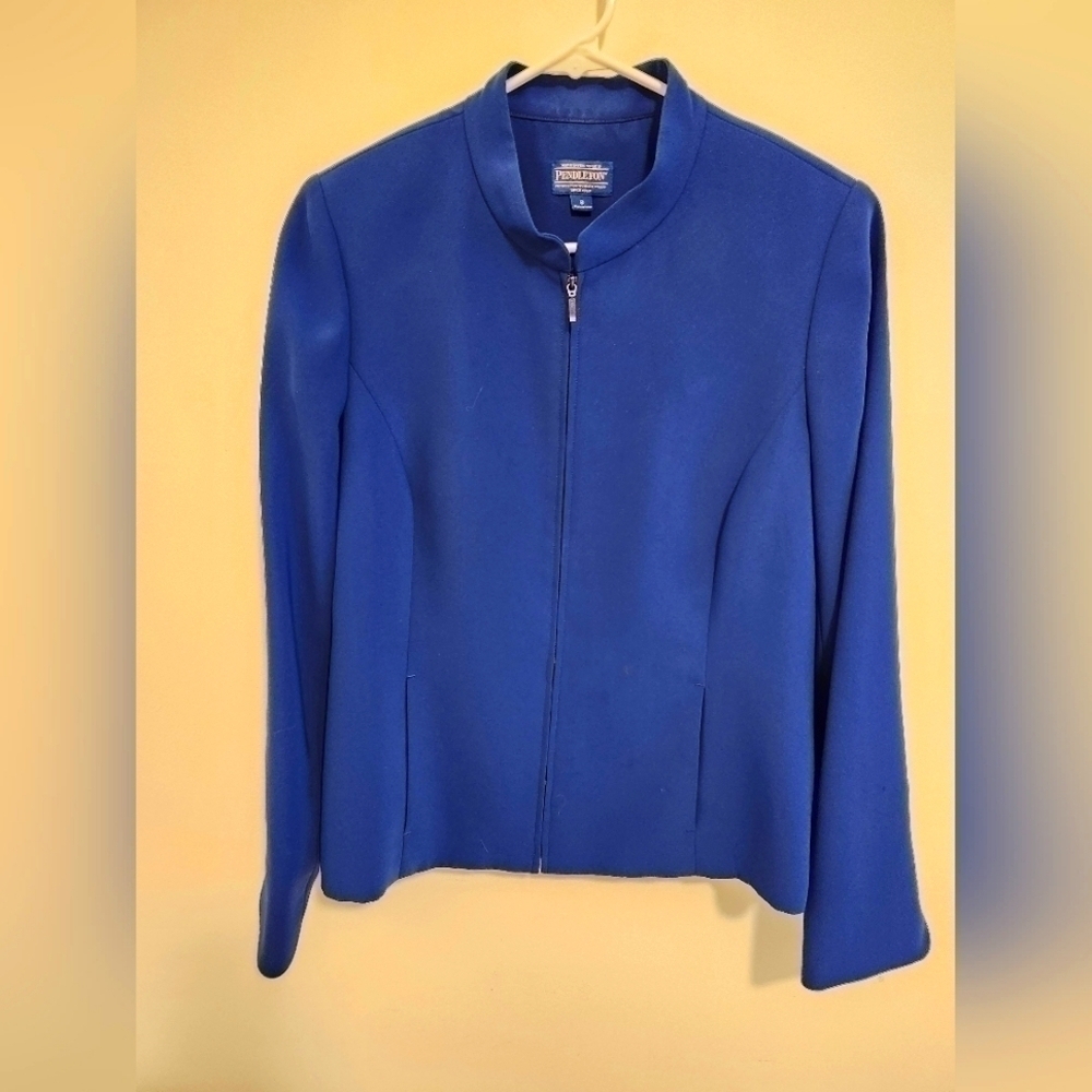 Pendleton Royal Blue Blazer size 8. One flaw see pic looks like a small snag. Lined polyester material. EUC. Shoulder to shoulder 15 inches. Pit to bottom 14 inches. Zipper front. Front pockets.