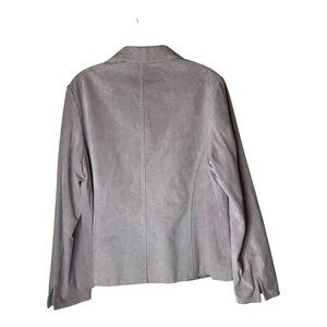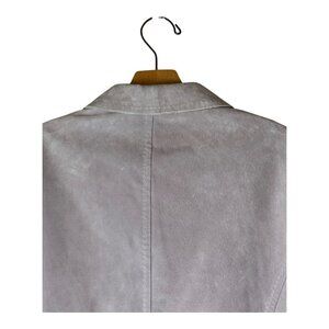 This leather blazer offers a sophisticated touch to any wardrobe. Its tailored design ensures a flattering fit, while the light purple hue adds timeless elegance.