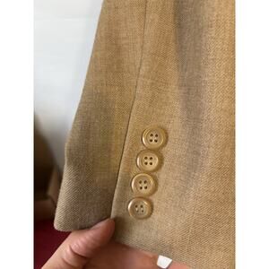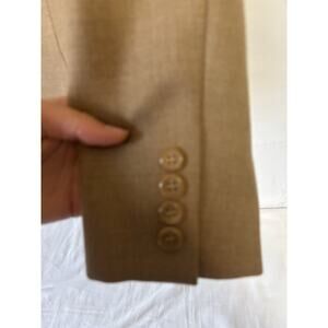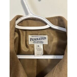 This is a Pendleton blazer for women in size 10, made from 100% virgin wool in a brown tan color. The jacket features a solid pattern, long sleeves, button closure, and is lined with polyester. It includes button accents and is designed as a basic jacket with a USA theme, suitable for dry clean only. This blazer is from Pendleton, a brand known for its quality wool products, and it was made in the United States.