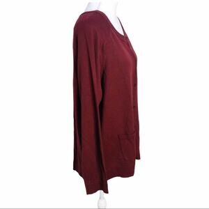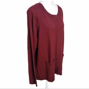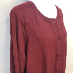 Excellent pre-owned condition cardigan by Pendleton is a beautiful wine color. Fabric tag is missing, but feels and looks like a gorgeous blend. Lighter weight. Button front and long knitted cuffed sleeves. Two front pockets. Truly beautiful.