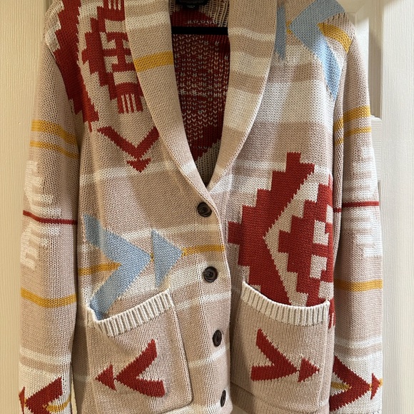 Vibrant geometric design with red, blue, and yellow accents. Perfect for layering. Stylish and warm.