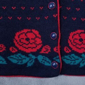 Add a touch of elegance to your wardrobe with this beautiful Pendleton cardigan sweater. The tight-knit wool fabric, featuring a stunning floral pattern in shades of blue and red, is perfect for the fall and winter seasons. The V-neckline and collarless design, along with the long sleeves and button accents, make it suitable for a variety of occasions, including travel, casual wear, and business meetings. This vintage sweater, made in the United States, is a regular fit and is available in size L. It is recommended to dry clean only to maintain its quality. The sweater is perfect for those who appreciate American style and Rose-themed clothing. It is a must-have for any fashion-conscious woman who wants to make a statement.