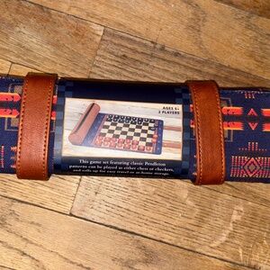- Roll out the fun at home, camp or on the road with this travel-friendly game set. Canvas playing board features a colorful Pendleton pattern, and rolls up for easy toting. Includes 32 silkscreened wooden games pieces that reverse for play as chess or checkers, plus a vegan leather storage bag. Instructions included.