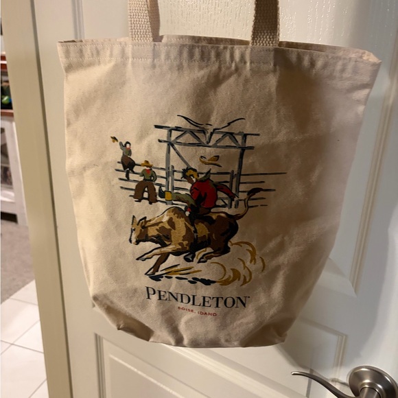 Pendleton tote with rodeo design. Cream canvas with colorful print. Ideal for daily use.