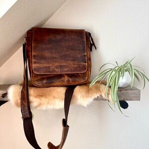 Perfect for everyday use, this Pendleton leather bag is the perfect size. You can adjust the strap to any length you like. Fringe was cut at the bottom of the bag but you can’t notice it. Smoke free home.