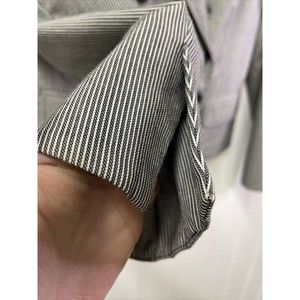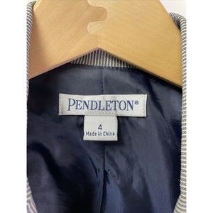 Pendleton Women's Blazer Sz 4 - please check the measurements in pictures Gray Pinstripe Double Breasted Lined Cotton, polyester, spandex Blend Flap pockets in front Faux pocket on chest Fully lined, polyester Padded Shoulders Great preowned condition