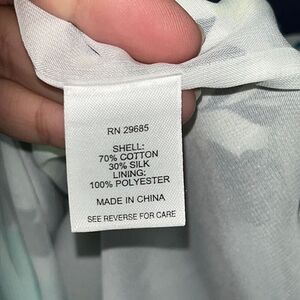 This dress is made by Pendleton. It is a silk/cotton blend fully lined and in a beautiful mix of blues and yellow with a white background. Size 6 petite and in very nice pre owned condition. Smoke and pet free home.