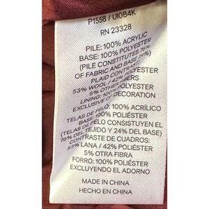Materials (from care tag): Pile 100% acrylic; Base 100% polyester; Plaid contrast 53% wool / 42% polyester / 5% other fibers; Lining 100% polyester