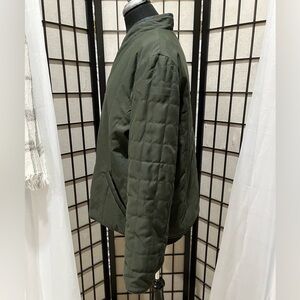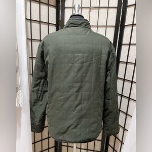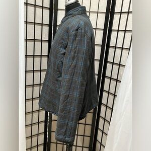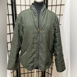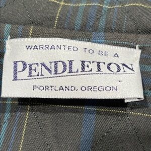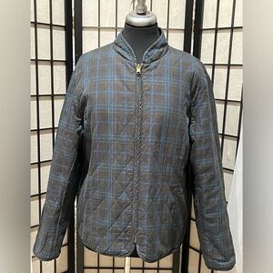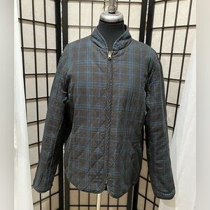 QUILTED REVERSIBLE JACKET by Pendleton. Features gray GREEN and blue with subtle yellow accents. LIGHT WEIGHT, FOR RANCH, HIKING AND CAMPING, ZIPPER FRONT, POCKETS ON THE SOLID DARK GRAY GREEN SIDE, NOT ON PLAID SIDE, PRE OWNED IN EXCELLENT CONDITION: