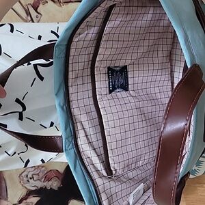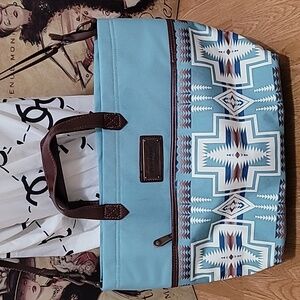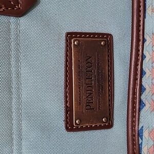 Pendleton Harding colection aqua tote in good condition minor signs has some minor marks on botton and on front upper part, measures about 14 inches in length and 12 1/2 inches in height. Elegant tote with a striking geometric design. Features durable brown handles.
