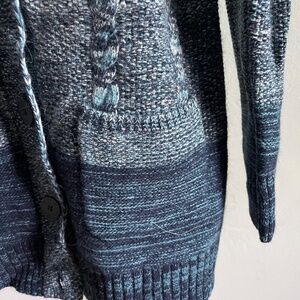 Gorgeous blend of blues! Button front, shawl collar, two pockets, ribbed trim