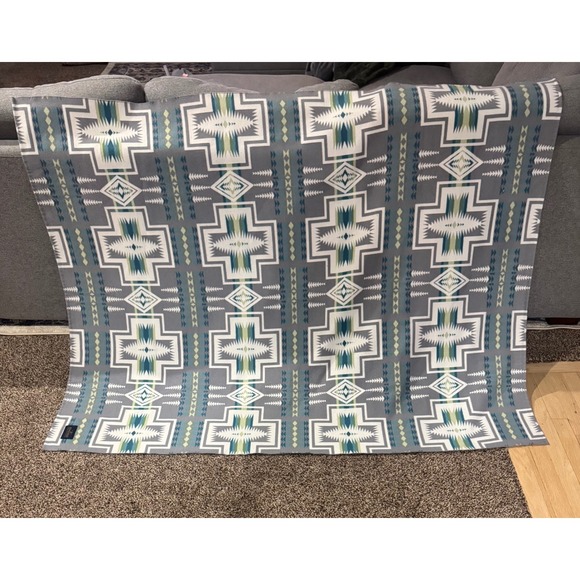 Pendleton Home Collection throw blanket showcases a striking Harding pattern in a contemporary grey, teal, and lime green color palette. Crafted with the brand's signature attention to detail, this soft textile features a reversible geometric design inspired by traditional Native American motifs. The clean finished edges and iconic woven logo patch reflect its high-quality construction, making it a versatile accent piece for a sofa, bed, or cabin decor.