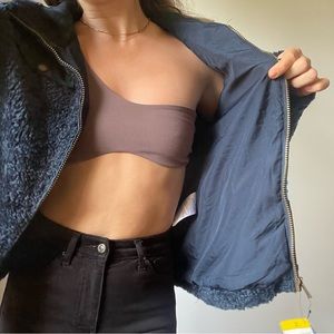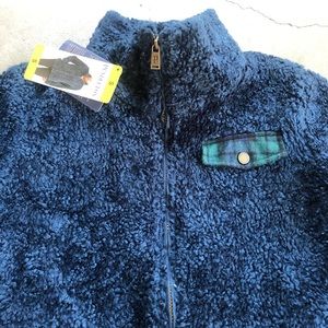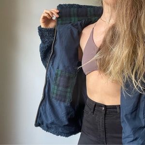 Blue Fuzzy Jacket with plaid details and fully functioning zipper. Brand new with tags - never worn. Size small. Double lined and super soft!