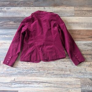 Stylish burgundy blazer with button-up front and pockets. Perfect for a chic look.