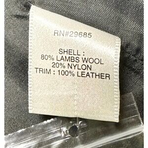 Shell is 80% Lambs Wool and 20% Nylon; The lower part of the jacket and the neckline trim is 100% Leather.