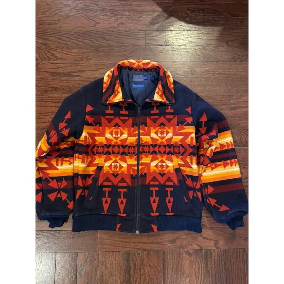 Vibrant bomber jacket with geometric patterns. Features a mix of red, orange, and yellow hues. Stylish and bold design.