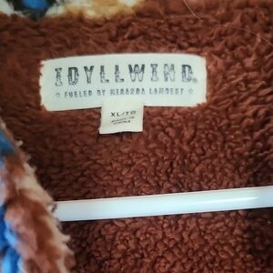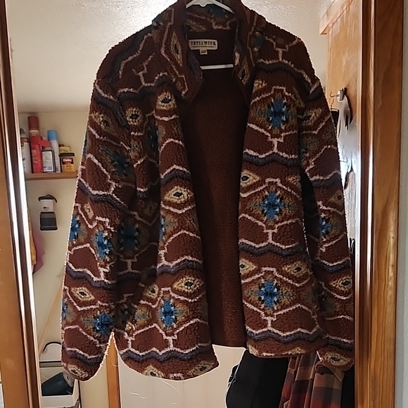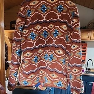 Cozy jacket with geometric design. Rich brown base with blue and tan highlights.