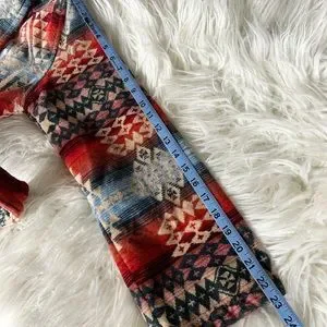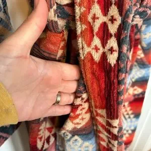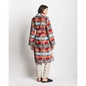 Stylish robe with vibrant geometric patterns. Features a blend of red, blue, and cream colors. Perfect for cozy lounging.
