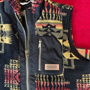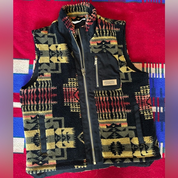 Vibrant Pendleton vest with geometric design. Features zip front and chest pocket. Ideal for layering.