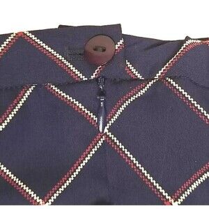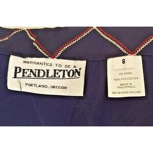 This beautiful Pendleton skirt features a classic navy blue plaid pattern, perfect for any occasion. The long, modest length and A-line style flatters any figure, while the zipper accents add a touch of sophistication. The skirt is brand new with tags, and is a size 8 for regular sized women. The material is made of polyester and is fully lined, ensuring comfort and quality. This skirt is a must-have for any fashion-savvy woman's wardrobe. Waist 27.5", hip 46.5", length 36".