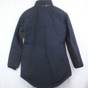 Dark navy blue Pendleton jacket. Zipper and snap button closure, plaid interior lining, Inside pocket, and a hidden hood in the collar. Back of jacket is a little longer than the front, see pictures. Large front pockets, with hidden pockets on the side of the large ones in front. Knitted material on the cuffs and collar. Very warm and great for the cold weather, rain, snow or just cold!