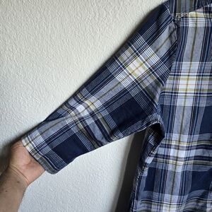 Classic plaid shirt with navy and yellow tones. Button-up style. Ideal for everyday wear.