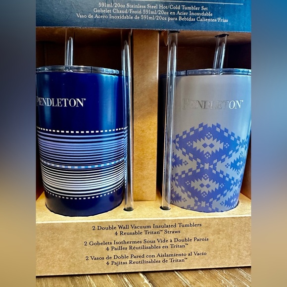 Made of double wall, vacuum-insulated stainless steel, these reusable 20oz tumblers are the perfect way to showcase your style on the go. Three versatile sipping options accommodate all of your hot or cold beverage choices. The bold colors and raised textures of these Pendleton designs showcase the epitome of American style, authenticity and craftsmanship.