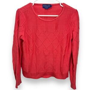 2- salmon/coral color cotton sweater. Some hot glue from an appliqué is on the front of sweater but this is removable. Otherwise no holes or rips.