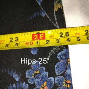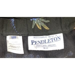 Previously Owned Pendleton Black skirt with blue and green floral designs. Zip and button closer. A little elastic on back waist. Chiffon type material.