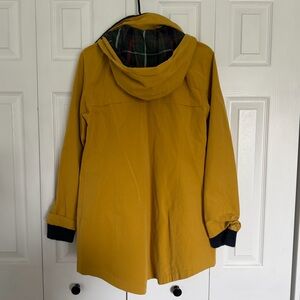 Excellent, like new condition rain coat from Pendleton. Classic yellow exterior and blue, green plaid interior. Longline fit with hood that is packable into the collar. Only worn once!