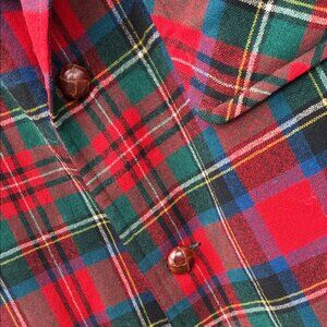 Classic Pendleton blazer with bold red and green plaid. Features button closure and front pockets.