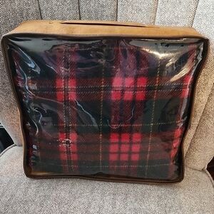 Approximately 53 X 68. Blanket is clean and in pristine condition. No holes. Bag has a small tear under handle.