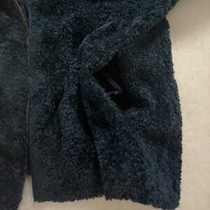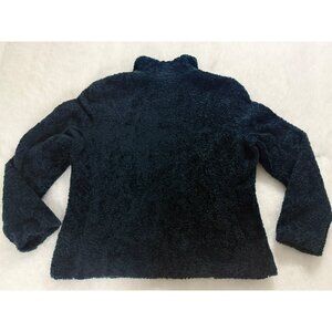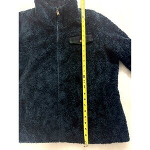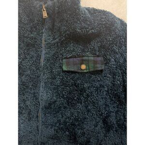 Cozy and classic Pendleton sherpa fleece jacket in navy blue, size XL (16). Full zip front, stand collar, and signature Pendleton wool plaid trim at the chest pocket. Soft, plush, warm, and perfect for fall/winter layering.