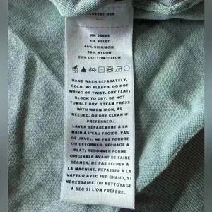 Color is a sage green. Silk / Nylon / Cotton blend. Crewneck. Mid weight.