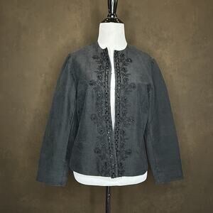 Elegant Pendleton embroidered and beaded jacket in classic black. This beautifully detailed piece features tonal floral embroidery with black bead embellishments, hook-eye front closures, and a soft silk-blend texture. Perfect for pairing with dress pants or skirts for an elevated, timeless look.