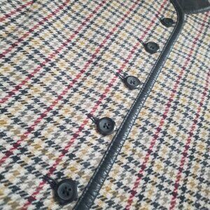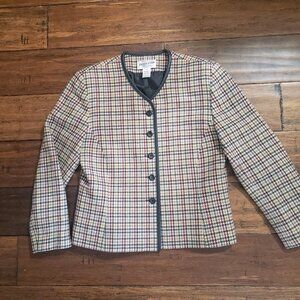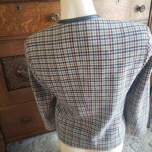 Wool short Blazer by Pendleton. Houndstooth in tan, red, blue and gray. Accented in faux letter trim.