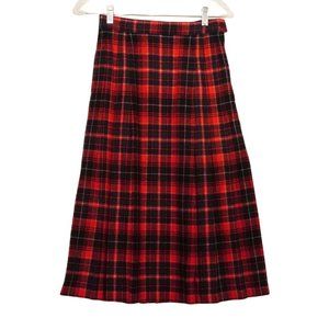 Red, Green, Black, & White Tartan plaid with pleats. Made of 100% Pure Virgin Wool in USA. Labeled a size 8 Petite.