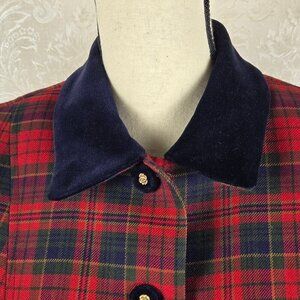 Colorful red, green and blue plaid with navy blue collar. Five buttons down the front are navy blue with gold centers. Two pockets on the front. Long sleeves. Fully lined. Padding at the shoulders. Dress it up with trousers or a skirt or dress it down with jeans.