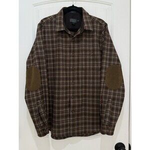 Pendleton Trail Button Shirt USA Virgin Wool Plaid Flannel Elbow Patch L Brown e