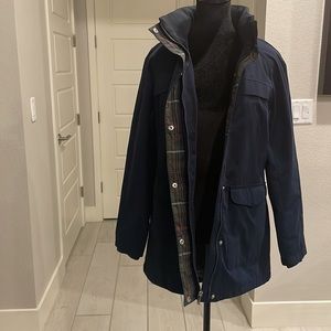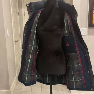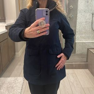 Beautiful heavyweight Pendleton trench style jacket with signature plaid lining. Zip button front, two flap button pockets, hidden rain hood in collar (undisturbed never used) trench style detail in back also longer in back (see pictures). This jacket will keep you warm with its cuffed sleeves‼️