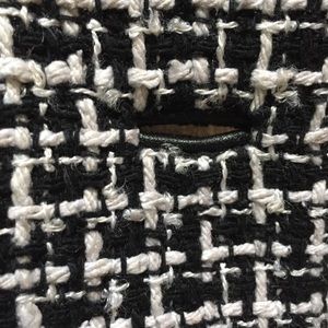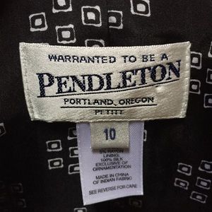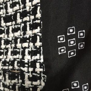 Pendleton black and white collarless blazer with black leather trim on neck, pockets, and buttonholes. Fully lined in 100% silk.