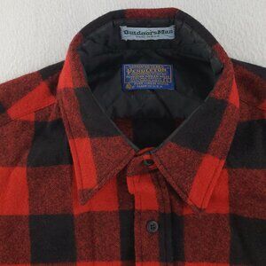 Vintage Pendleton 100% wool made in USA plaid shirt (via Outdoor Man), men's size large. Thickness is best described as mid-weight (somewhere between a regular shirt and shirt-jacket thickness). I've included exact measurements, so you'll know if this fits you or not. Ships safely in a secure box :)