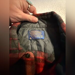 Classic Pendleton plaid shirt. Features red and black pattern. Ideal for casual outings.