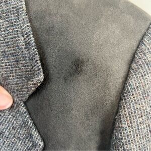There is a small spot to the suede at chest that looks worn/rough. There is a tiny spots to interior lining. Please see all pics. Overall in good preowned condition.